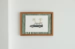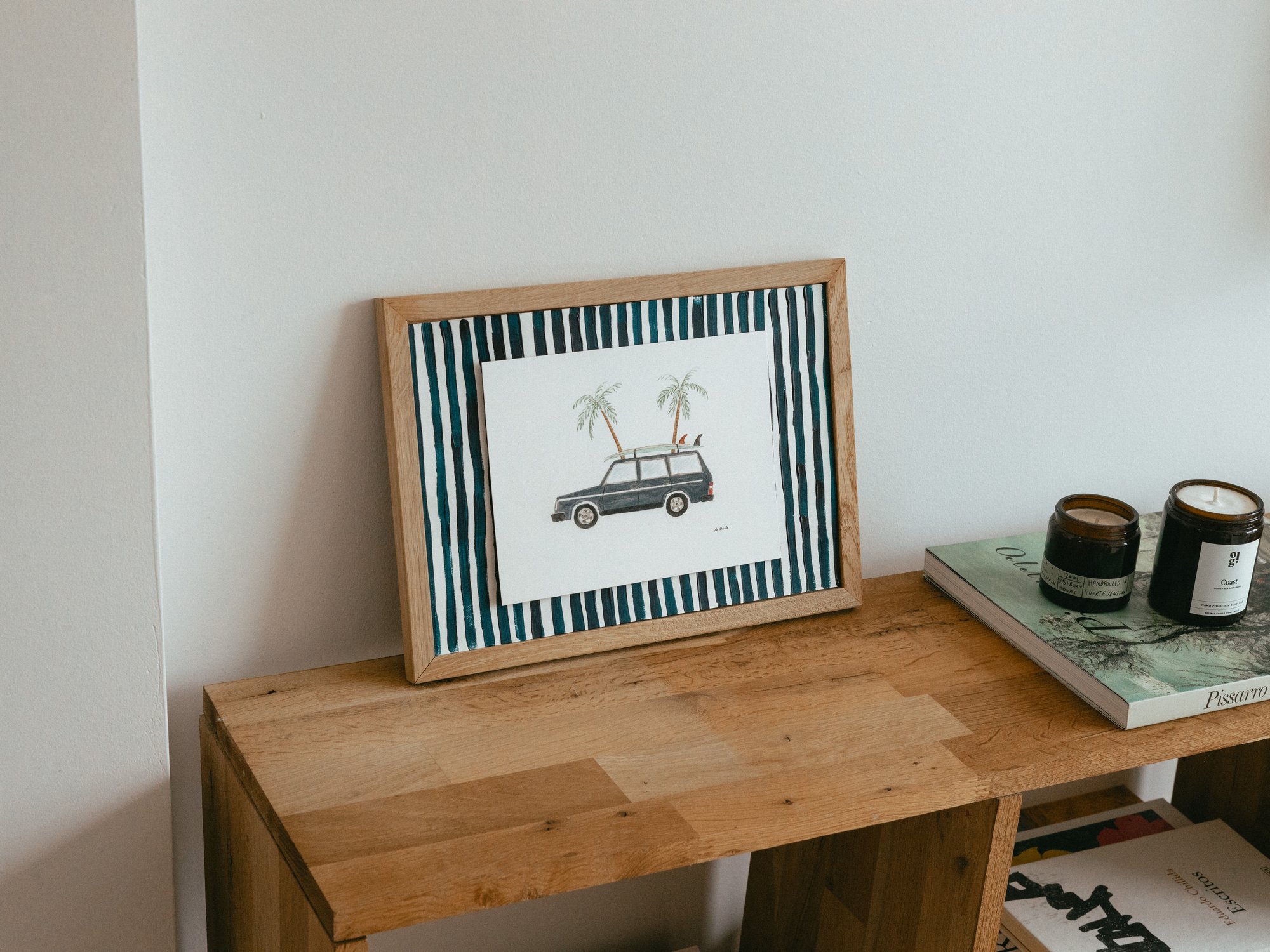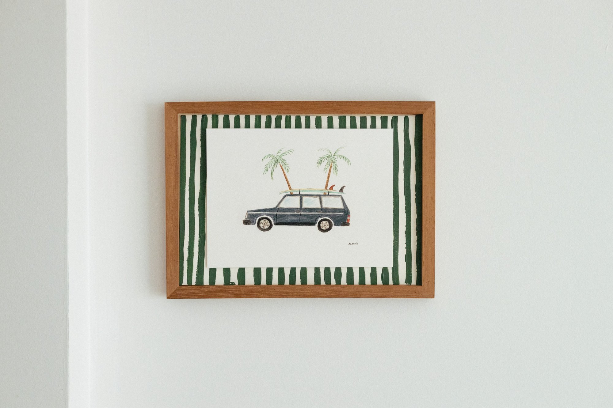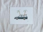 ilustración original de un un coche antiguo con tablas de surf y palmeras.